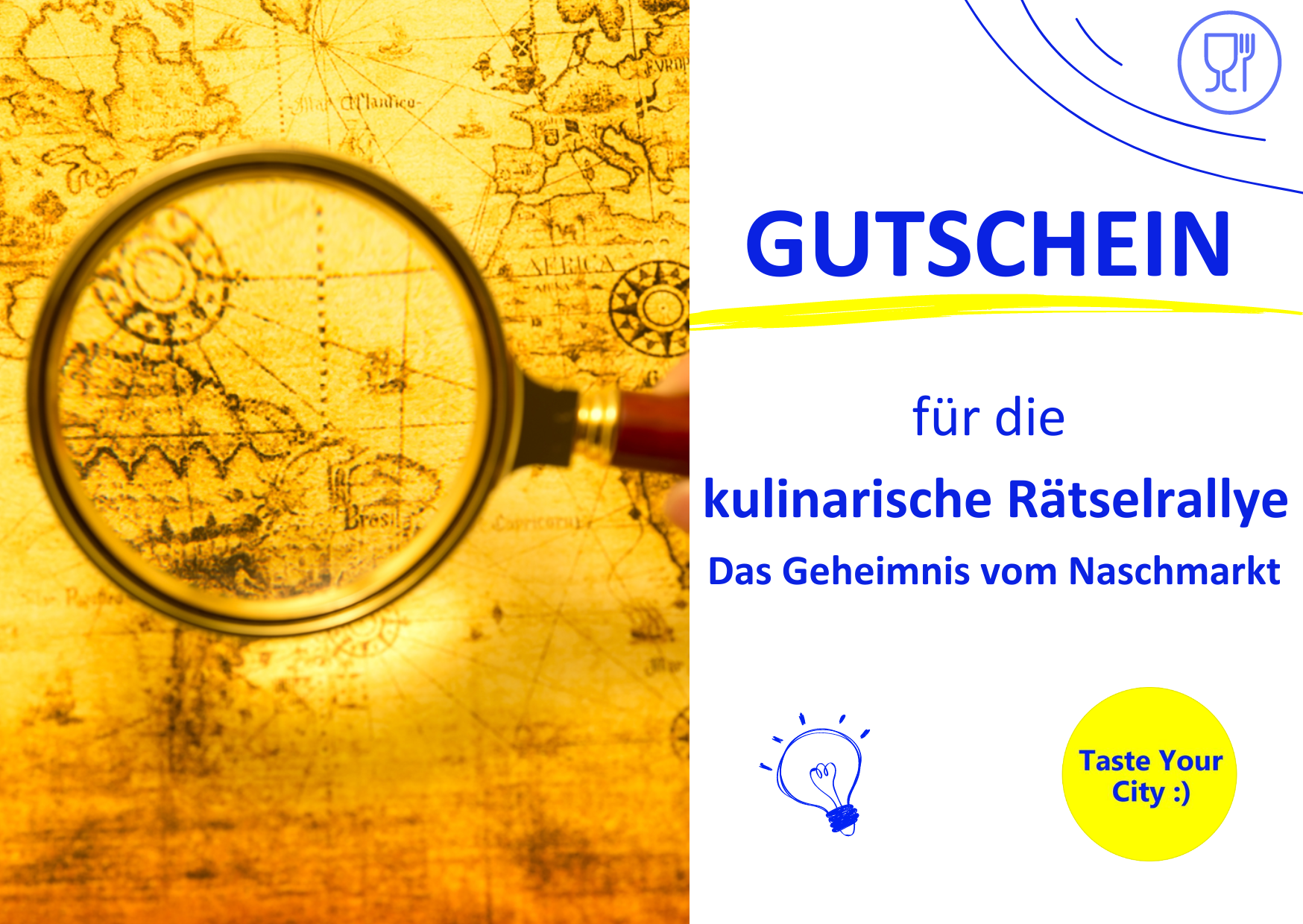 Dieser Gutschein ist für die kulinarische Rätselrallye "Das Geheimnis vom Naschmarkt" gültig. Die Anzahl der Tickets entspricht der Anzahl der teilnehmenden Personen bei der Rätselrallye. Der Gutschein ist ein Jahr ab der Ausstellung gültig.