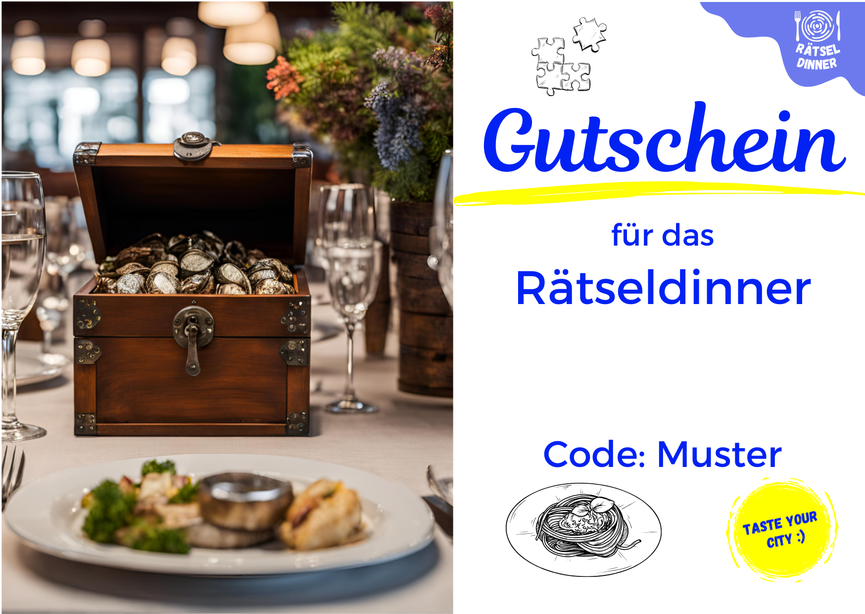 Dieser Gutschein ist für das Rätseldinner gültig. Die Anzahl der Tickets entspricht der Anzahl der teilnehmenden Personen. Der Gutschein ist ein Jahr ab der Ausstellung gültig.